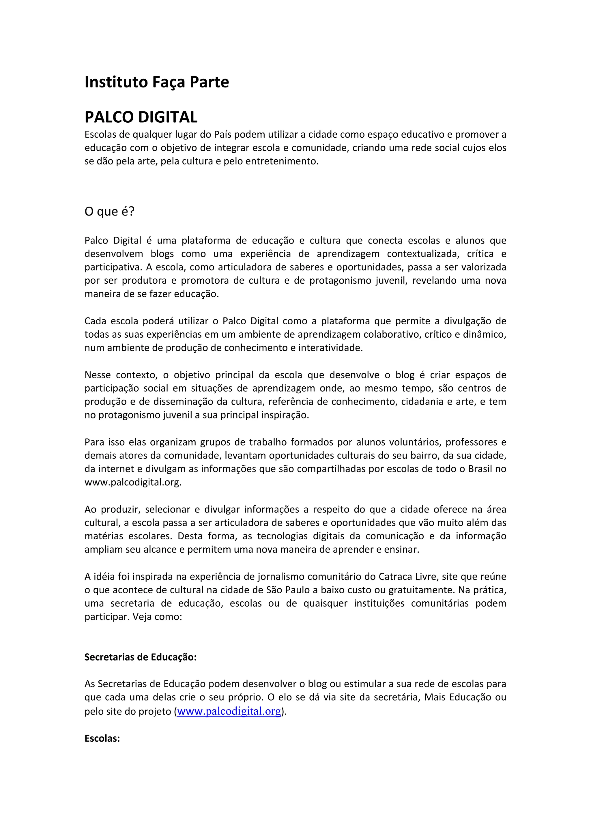 O Palco Digital é uma plataforma que conecta escolas e alunos para desenvolver blogs como experiência de aprendizagem contextualizada e participativa. As escolas podem usar a plataforma para divulgar experiências e se tornar produtoras e promotoras de cultura e protagonismo juvenil. O objetivo é integrar escola e comunidade através da arte, cultura e entretenimento.