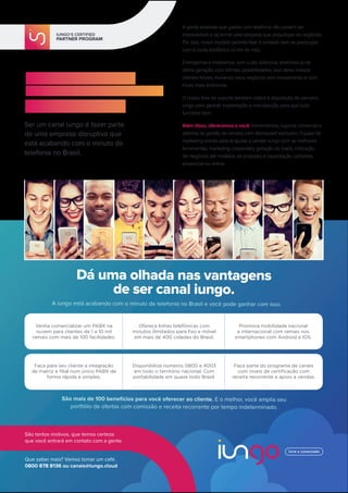 A iungo oferece um sistema de telefonia em nuvem (PABX) com tarifa fixa e minutos ilimitados para fixo e celular. O sistema permite trabalhar de qualquer lugar e liberdade para os clientes sem preocupações com custos imprevisíveis. A empresa convida parceiros a se tornarem canais de vendas da iungo para participar da revolução e acabar com o minuto de telefonia no Brasil.