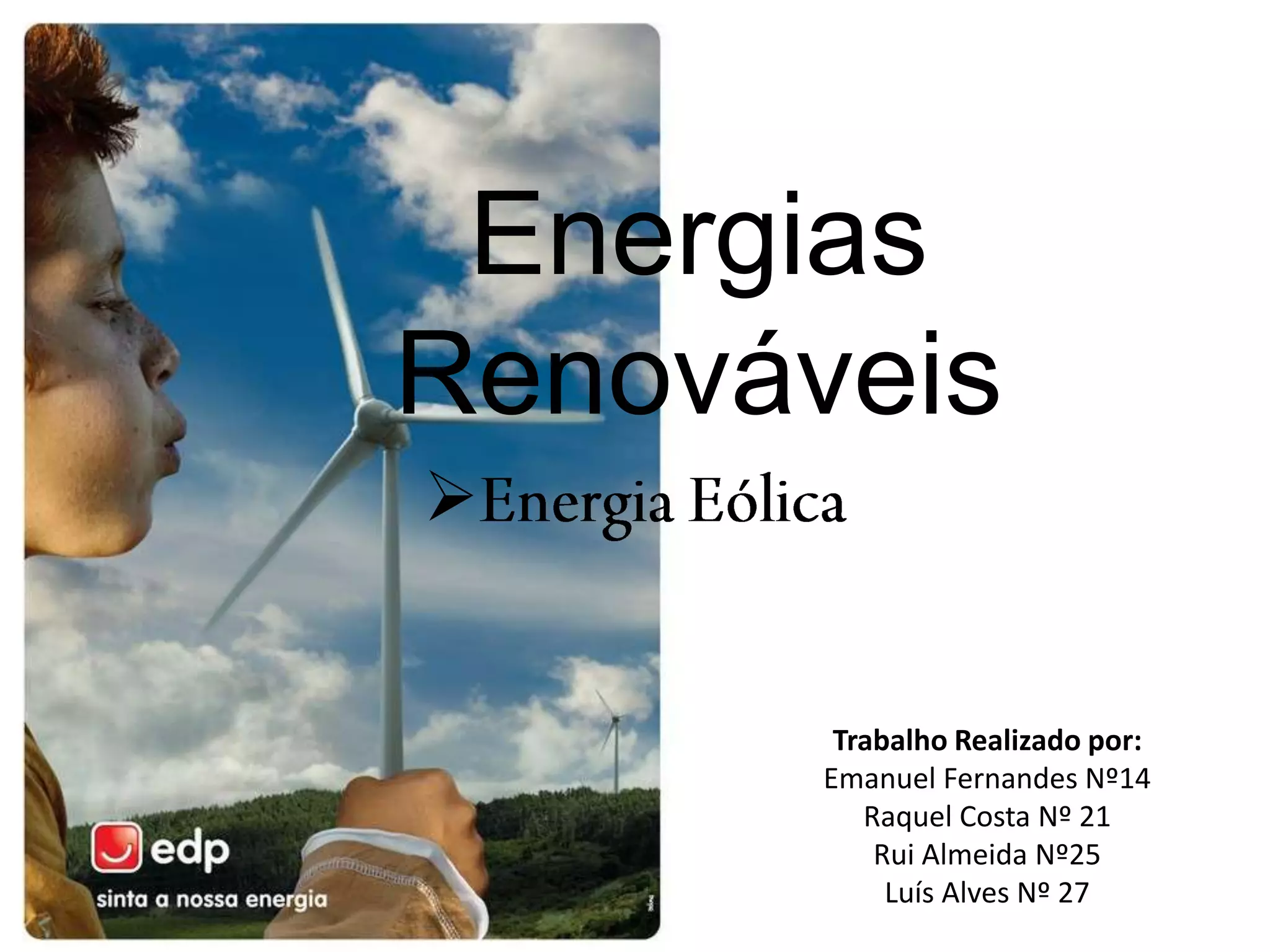 Este documento discute energias renováveis e energia eólica. Ele define energias renováveis, lista seus tipos principais e explica que a energia eólica converte a energia cinética do vento em eletricidade usando aerogeradores. O documento também discute os prós e contras da energia eólica e seu uso crescente em Portugal.