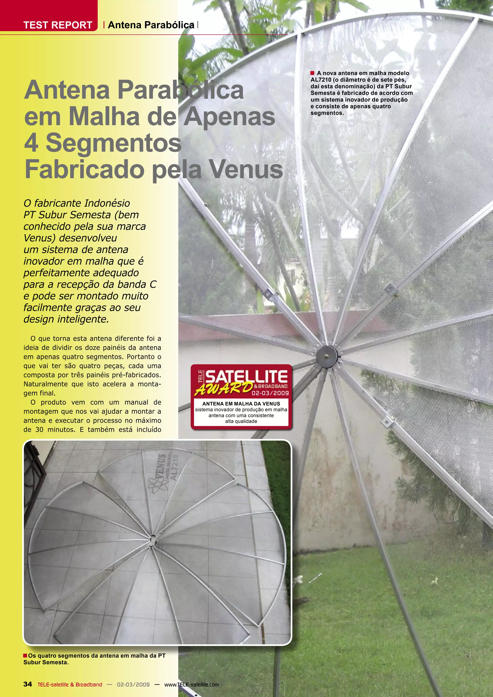 O relatório descreve uma nova antena parabólica em malha desenvolvida pela PT Subur Semesta. A antena possui apenas quatro segmentos em vez de doze painéis, tornando a montagem mais rápida. Após a montagem e afinação, que levam menos de 30 minutos, é possível receber sinais de televisão por satélite com qualidade.