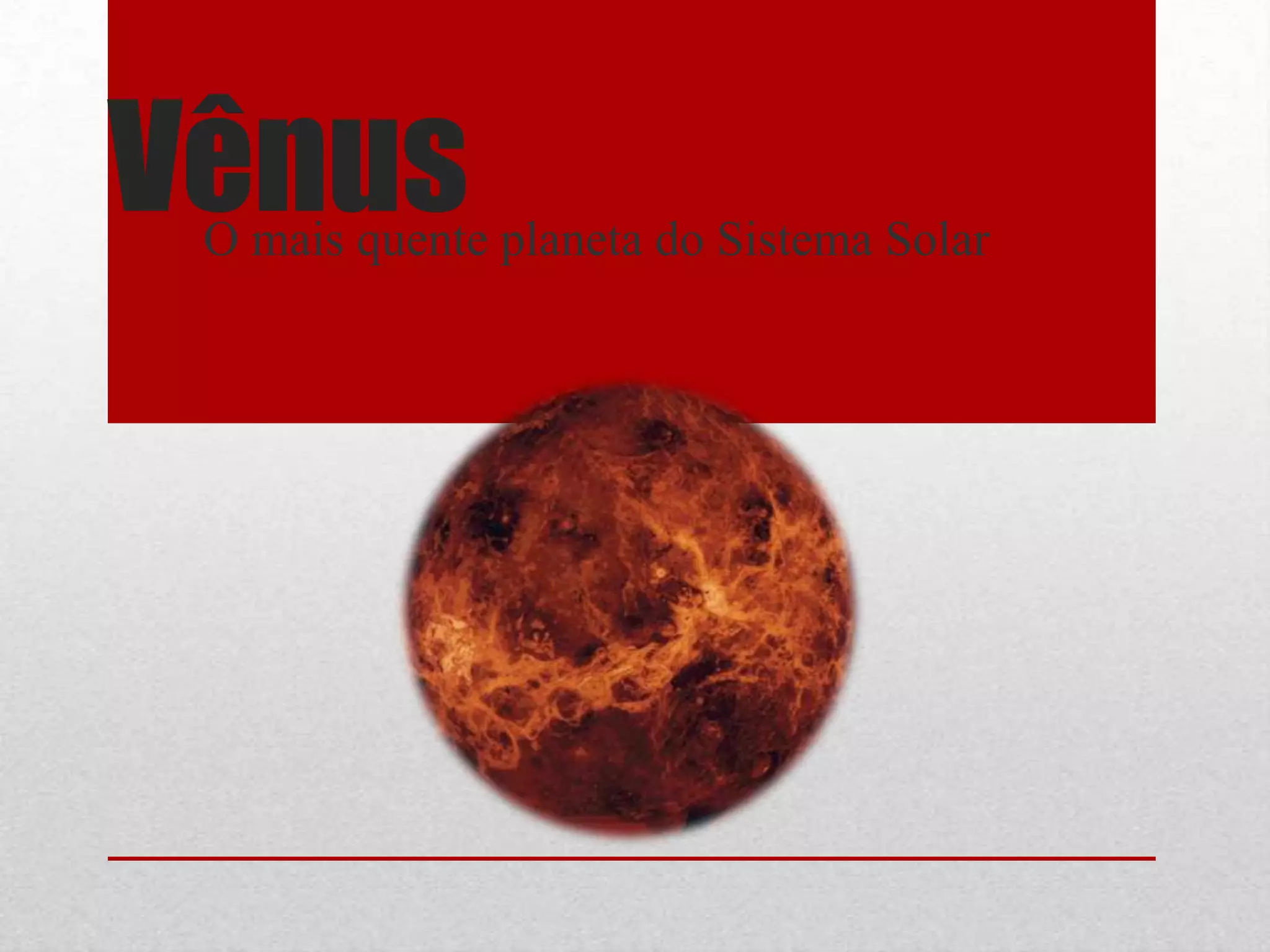 Vênus é o planeta mais quente do Sistema Solar, com temperaturas de 482°C. Sua superfície é coberta em 85% por rochas vulcânicas, com mais de 100.000 pequenos vulcões. Vênus não possui oceanos, luas ou satélites naturais.
