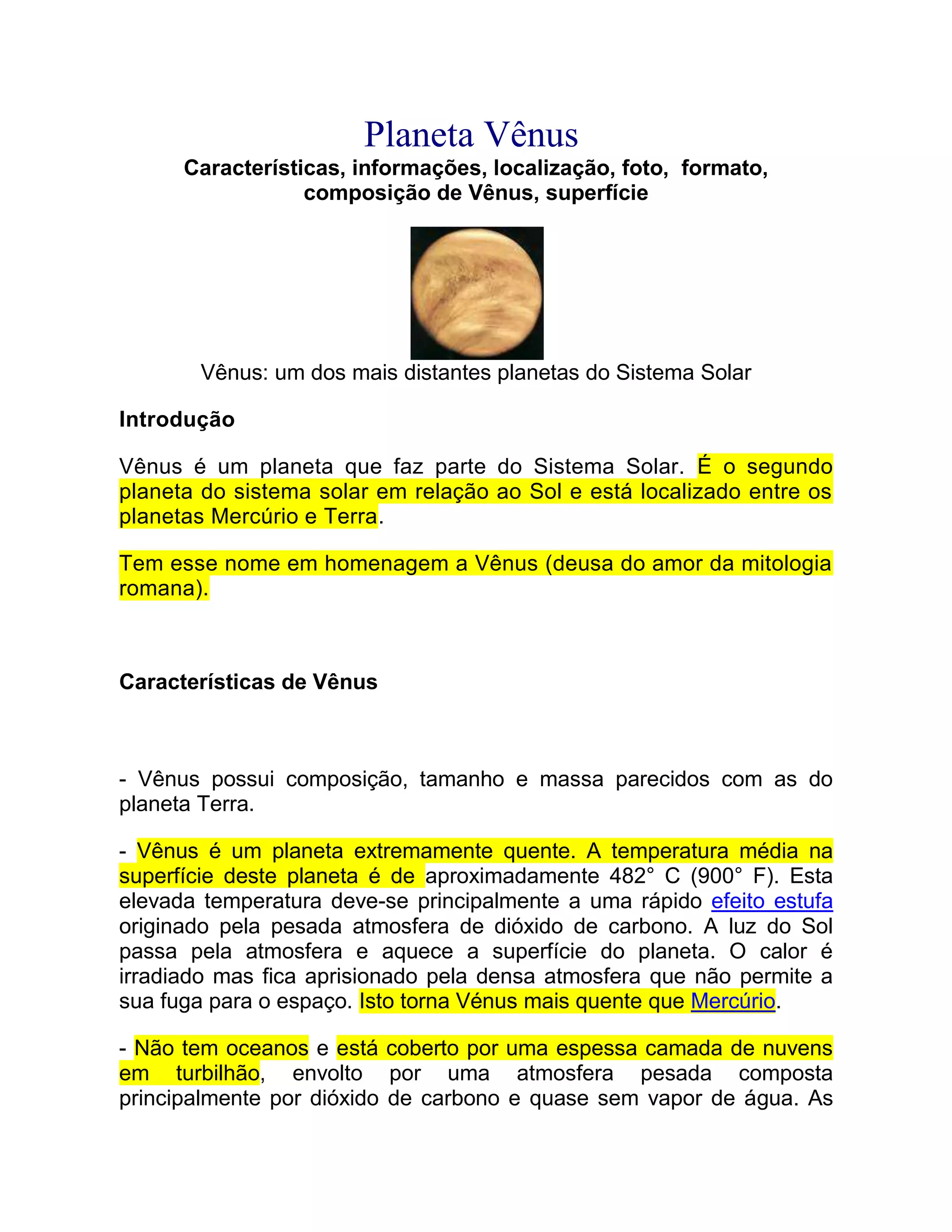 Vênus é o segundo planeta do Sistema Solar e tem características semelhantes à Terra, mas com uma atmosfera quente e densa que mantém temperaturas acima de 480°C. Sua superfície é marcada por muitas crateras e atividade vulcânica, sem oceanos, coberta por nuvens de dióxido de carbono. Um dia em Vênus é mais longo que seu ano, e ele gira em sentido oposto à Terra.