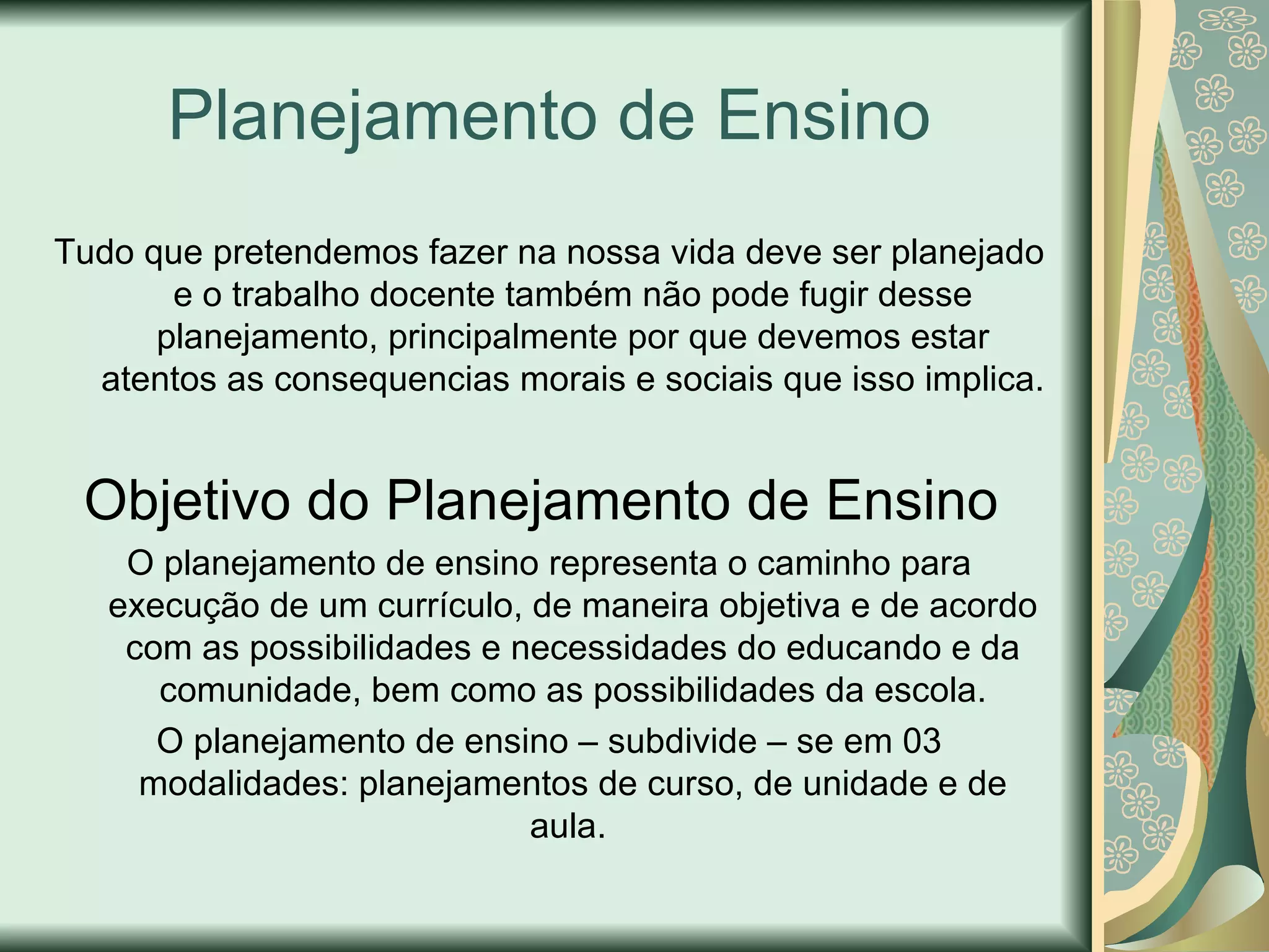 O documento discute a importância do planejamento de ensino para alcançar os objetivos educacionais de forma objetiva e de acordo com as necessidades dos alunos e da comunidade. Existem três níveis de planejamento: de curso, de unidade e de aula. O planejamento de aula deve incluir o assunto, objetivos, conteúdo, procedimentos, recursos, tempo e forma de avaliação.