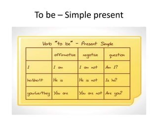 O documento explica como usar o verbo "to be" no presente em inglês. Ele descreve como "am", "is" e "are" são usados com diferentes pronomes pessoais, como "I am", "he is" e "they are". O documento também fornece exemplos de frases afirmativas, negativas e interrogativas usando "to be" no presente.