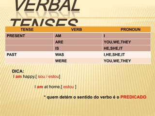 O documento discute os tempos verbais em inglês, fornecendo exemplos de estruturas afirmativas, negativas e interrogativas para cada um. Ele explica os verbos auxiliares e as formas dos verbos regulares e irregulares no passado. O documento também fornece instruções para exercícios práticos de mudança de frases entre os diferentes tempos verbais.