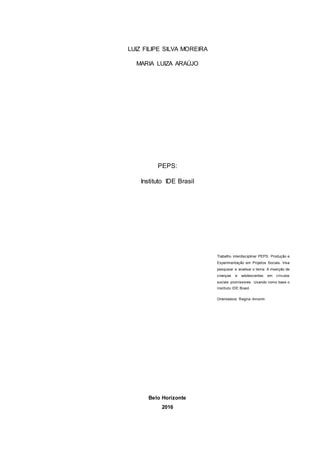 O documento apresenta o Instituto IDE Brasil, fundado em 2006 na comunidade Pedreira Prado Lopes, com o objetivo de apoiar crianças e adolescentes em vulnerabilidade social. O instituto realiza diversos projetos que promovem educação, cultura e inclusão social, resultando em redução da criminalidade e oportunidades para seus beneficiados. As coordenadoras destacam a importância da mobilização comunitária e o uso de ferramentas digitais para engajamento e divulgação das atividades do instituto.