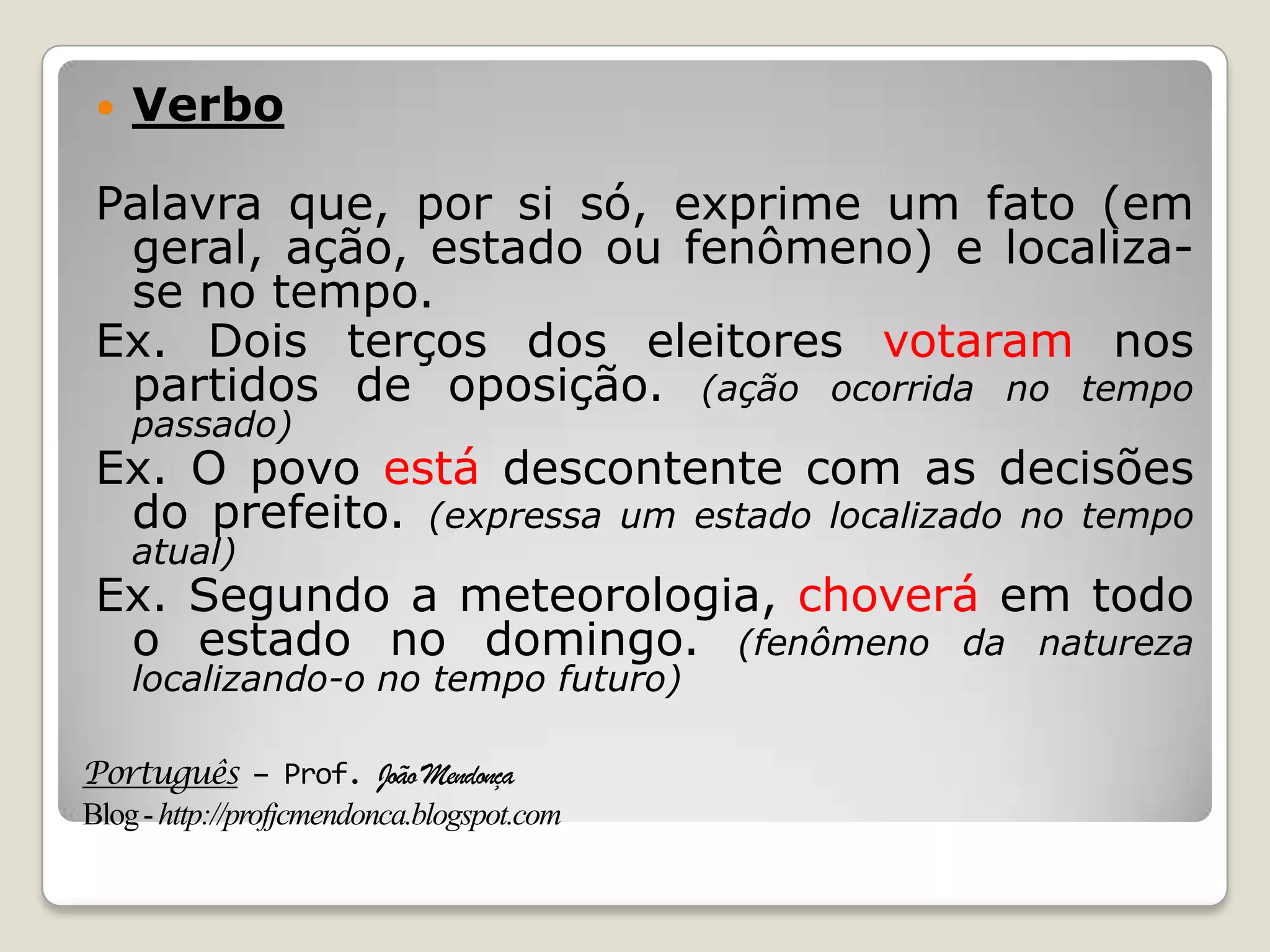 O documento discute as características dos verbos na língua portuguesa, incluindo:
