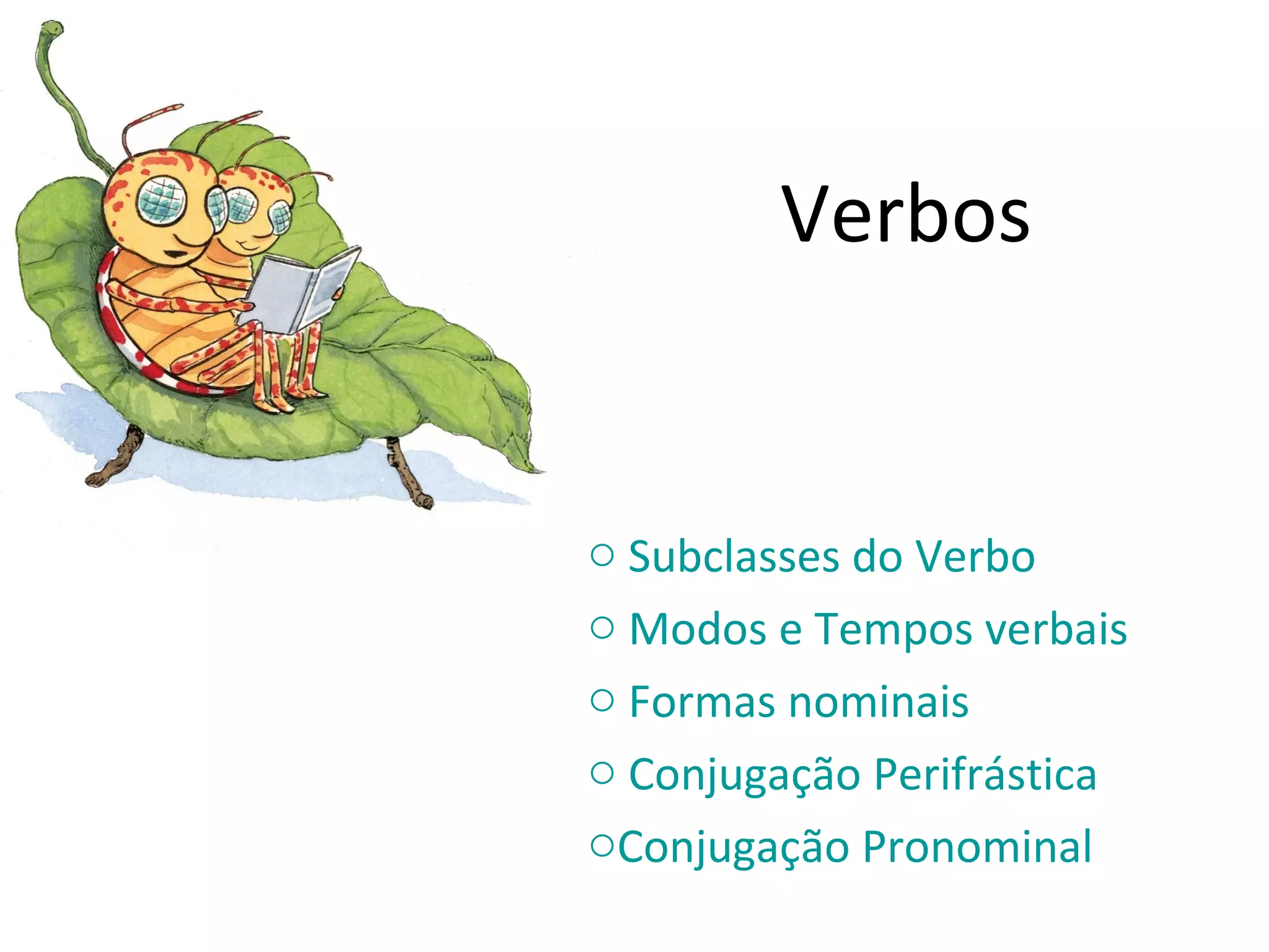 1) O documento descreve diferentes subclasses de verbos, modos e tempos verbais, formas nominais e tipos de conjugação.