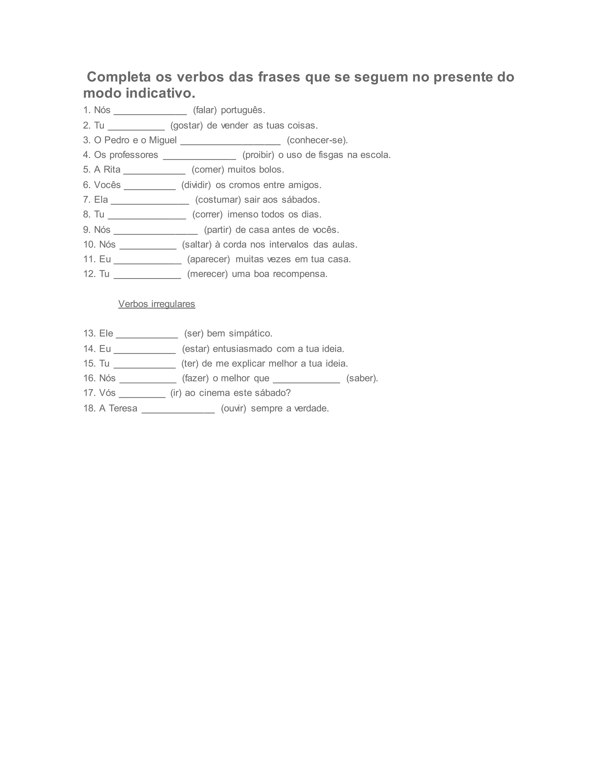 1. O documento apresenta uma série de frases incompletas com verbos no infinitivo que devem ser conjugados de acordo com o tempo verbal ou modo gramatical indicado. 2. São propostos exercícios de conjugação verbal em vários tempos e modos como presente, pretérito, futuro, condicional e conjuntivo. 3. O resumo fornece as informações essenciais sobre o tipo de exercício proposto no documento de forma concisa em 3 frases.
