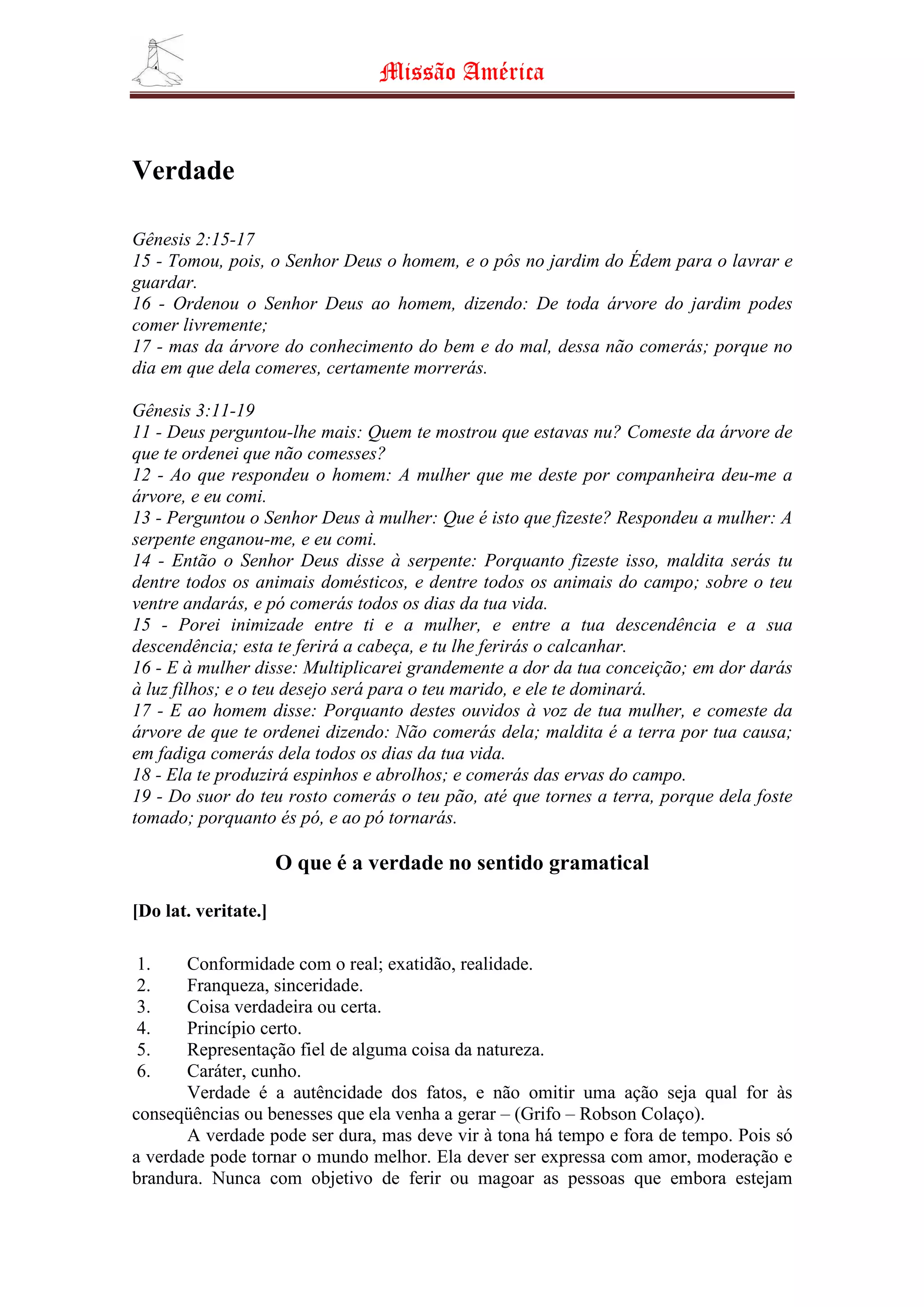 Este documento discute a verdade versus a mentira de acordo com a Bíblia. Ele resume como Adão e Eva desobedeceram a Deus ao comer do fruto proibido e depois mentiram para cobrir suas ações. Também explora como a mentira é considerada um pecado grave segundo a Bíblia e como Jesus oferece graça para aqueles que desejam viver uma vida de verdade.