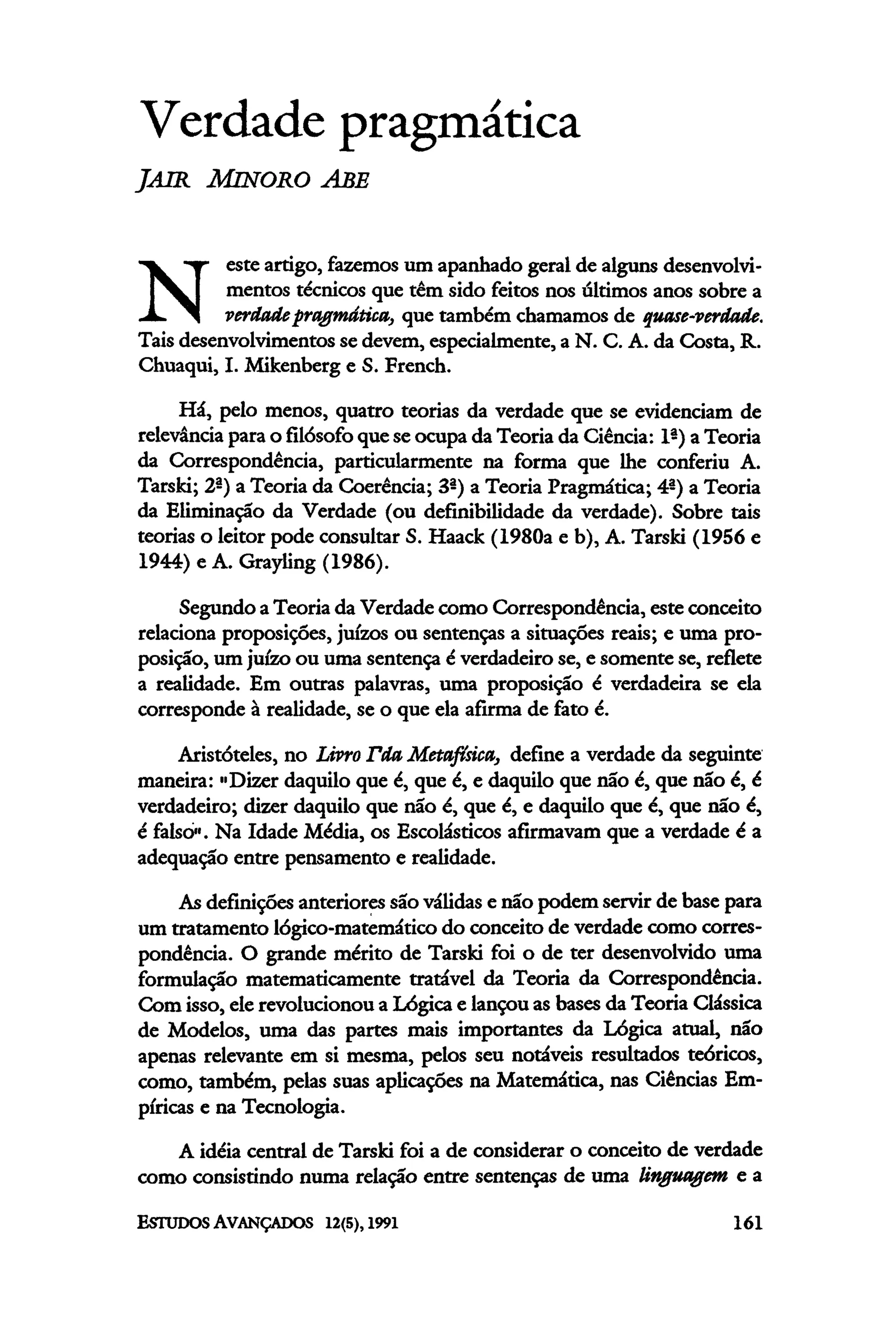 2) A teoria da verdade pragmática é atribuída a Peirce e formalizada por Costa, Chuaqui e Mikenberg em termos de "quase-verdade".