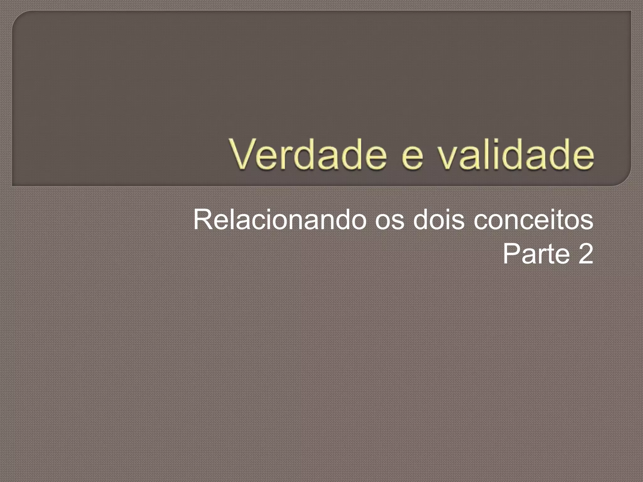 O documento discute a noção de validade formal em lógica. Um argumento é válido quando as premissas necessariamente levam à conclusão - ou seja, se as premissas forem verdadeiras, a conclusão não pode ser falsa. Dois exemplos ilustram argumentos válidos e inválidos. A validade de um argumento é testada imaginando se a conclusão pode ser falsa enquanto as premissas permanecem verdadeiras.