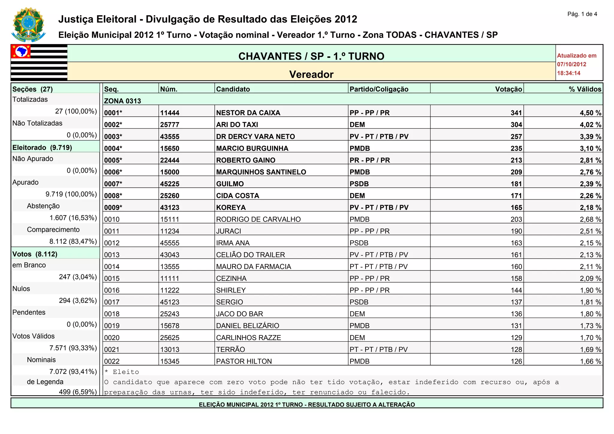 Este documento apresenta os resultados da votação para vereador no primeiro turno das eleições municipais de 2012 em Chavantes, SP. Foram apurados os votos em 27 seções eleitorais, com um total de 8.112 votos válidos. Os 15 candidatos mais votados receberam entre 341 e 209 votos. O documento lista o nome, número, partido e quantidade de votos recebidos por cada um dos 83 candidatos.