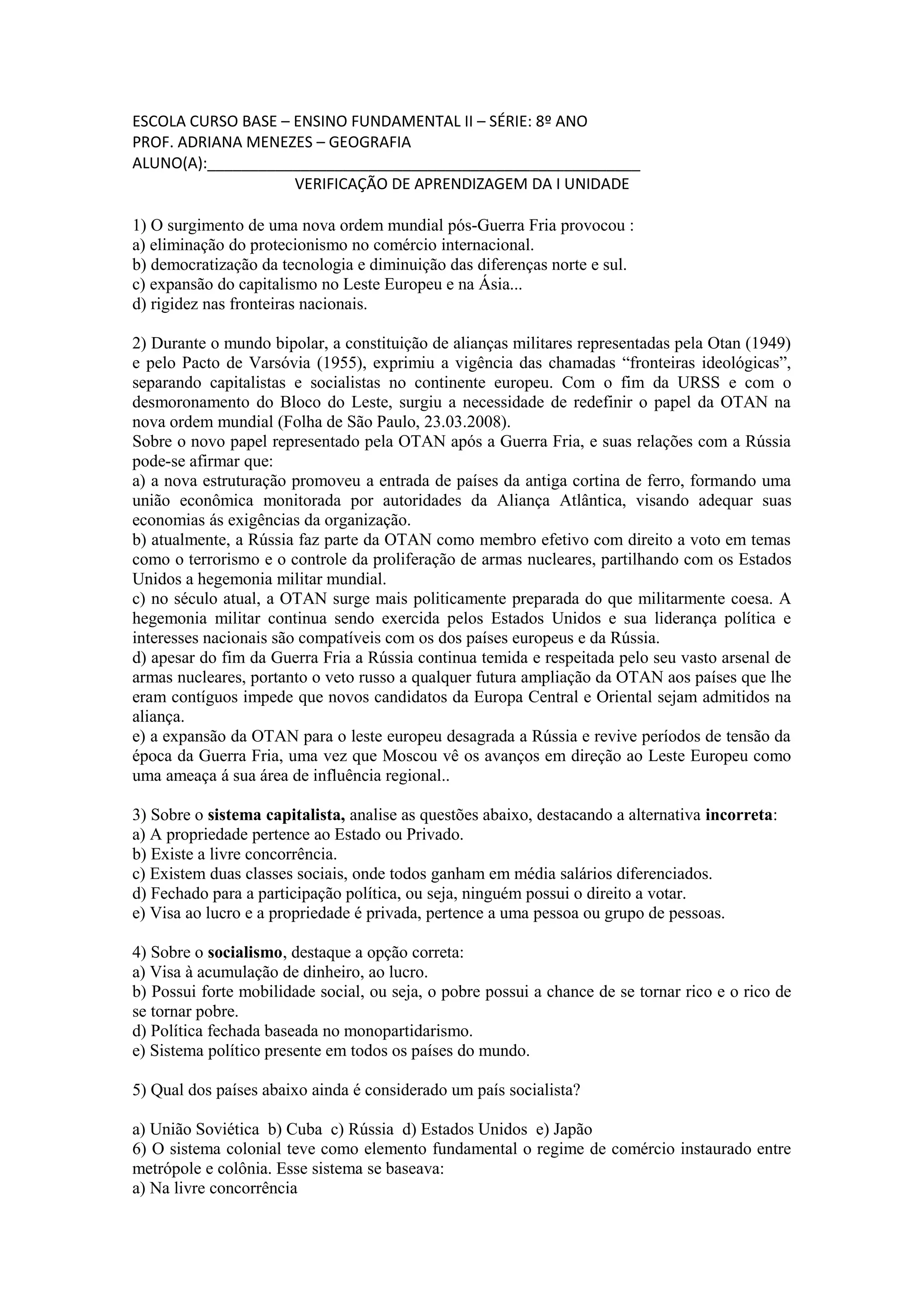O documento contém uma prova de geografia com 10 questões sobre diversos tópicos como posição geográfica do Brasil, expansão territorial durante o período colonial, divisão político-administrativa, escravidão indígena e africana no Brasil. Os alunos devem responder as questões marcando as alternativas corretas ou preenchendo respostas curtas.