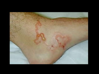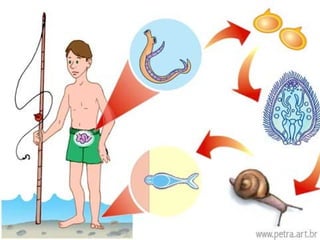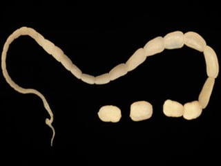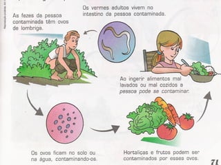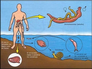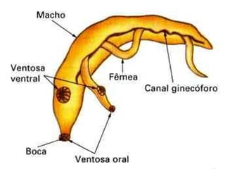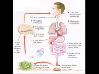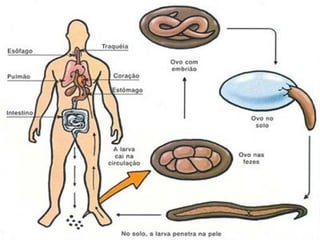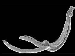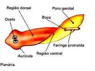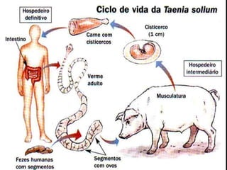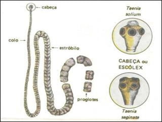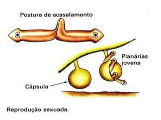 O documento descreve três filos de vermes: Platelmintos, Anelídeos e Nematódeos. Os Platelmintos incluem planárias e tênias e se reproduzem de forma sexuada ou assexuada. Os Anelídeos incluem minhocas. Os Nematódeos, como a lombriga e o ancilóstomo, têm sistema digestivo completo e reprodução sexuada.