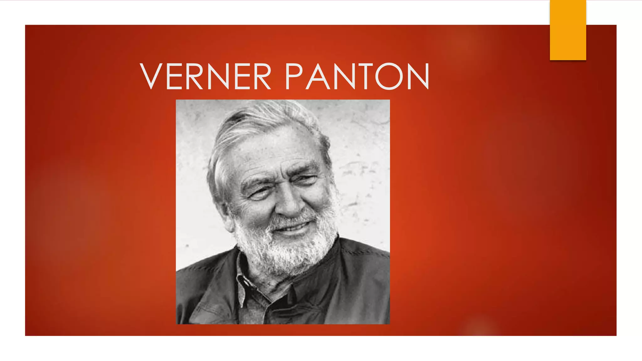 Verner Panton foi um designer dinamarquês nascido em 1926 que inovou o design de mobiliário na segunda metade do século 20 através de formas orgânicas e vibrantes em plástico. Sua cadeira "Panton" de 1960 tornou-se um ícone do design e ele projetou espaços psicodélicos nos anos 60 que refletiam a visão futurista da época. Panton queria quebrar a rigidez do design e dar humor às formas.