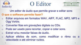 O documento descreve as principais funcionalidades do editor de áudio gratuito e de código aberto Audacity. Ele permite gravar, editar e aplicar efeitos em arquivos de áudio, podendo importar e exportar diversos formatos. O documento explica como usar as ferramentas de gravação, edição, aplicação de efeitos e análise espectral, além de resumir a arquitetura e componentes do software.