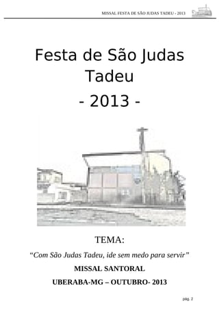 Este documento é um missal para as celebrações da festa de São Judas Tadeu em outubro de 2013 em Uberaba, MG. Contém informações sobre o tema da festa, orações, leituras bíblicas e detalhes sobre as missas que serão realizadas, incluindo intenções e homilias.
