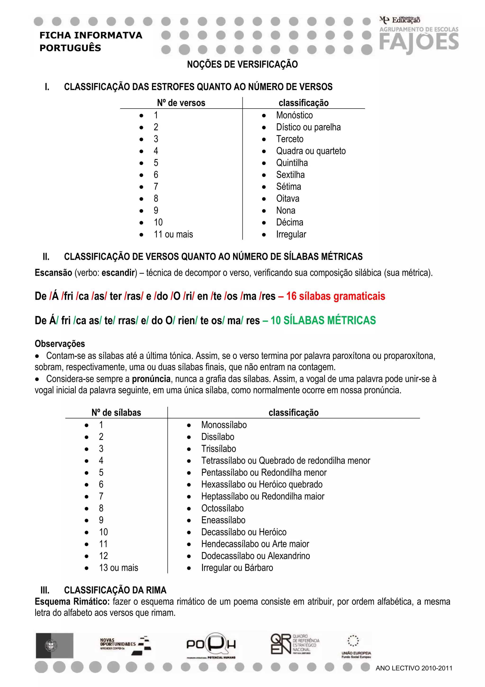 Este documento fornece noções básicas sobre a versificação em português. Apresenta a classificação de estrofes de acordo com o número de versos, a classificação de versos de acordo com o número de sílabas métricas e a classificação da rima quanto ao lugar, classe gramatical e correspondência de sons.