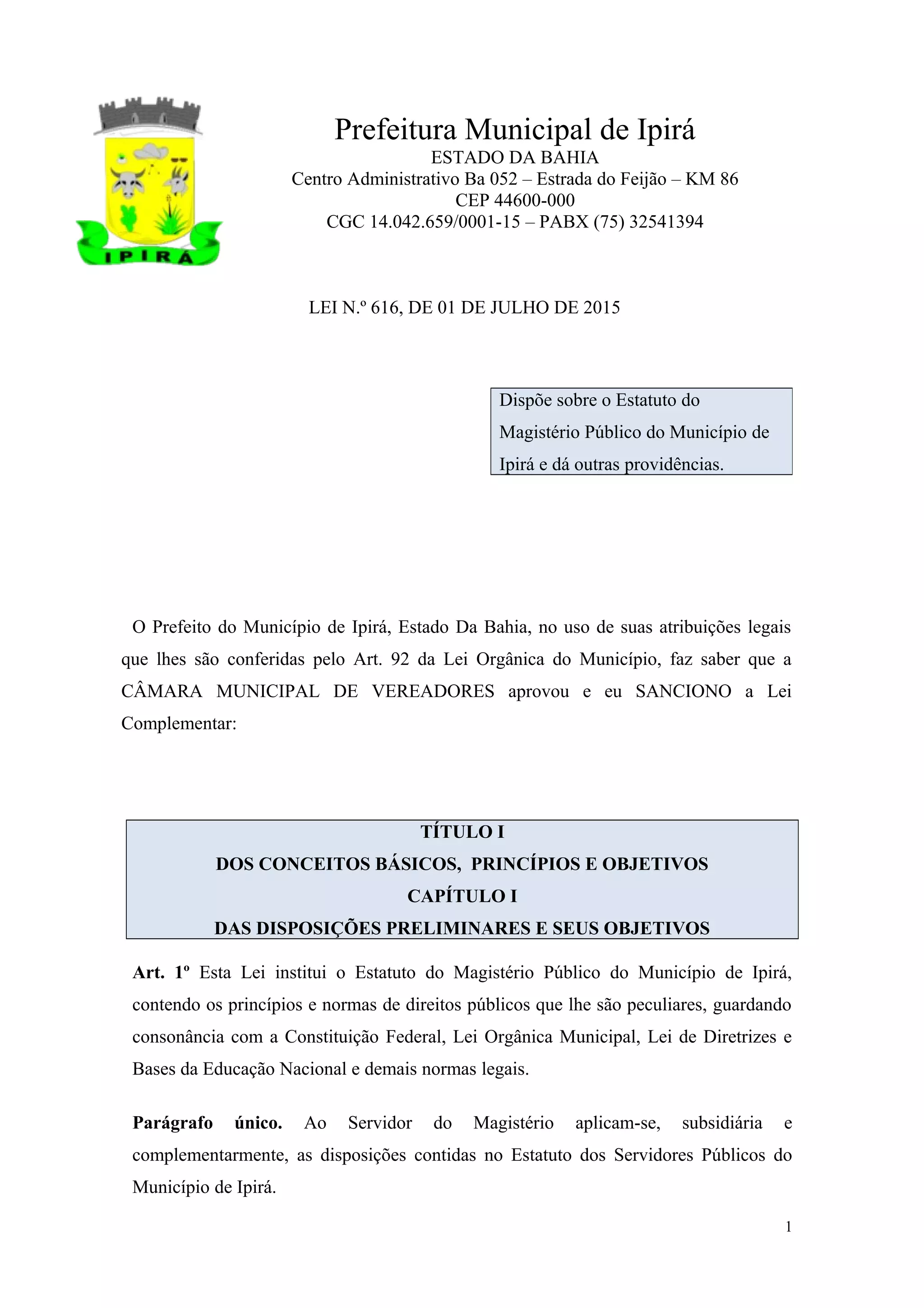 Este documento estabelece o Estatuto do Magistério Público do Município de Ipirá, na Bahia. Ele define os princípios, normas e direitos dos professores e outros profissionais da educação, estrutura a carreira docente em níveis e classes, e estabelece regras sobre concursos públicos, ingresso, nomeação, posse e lotação.