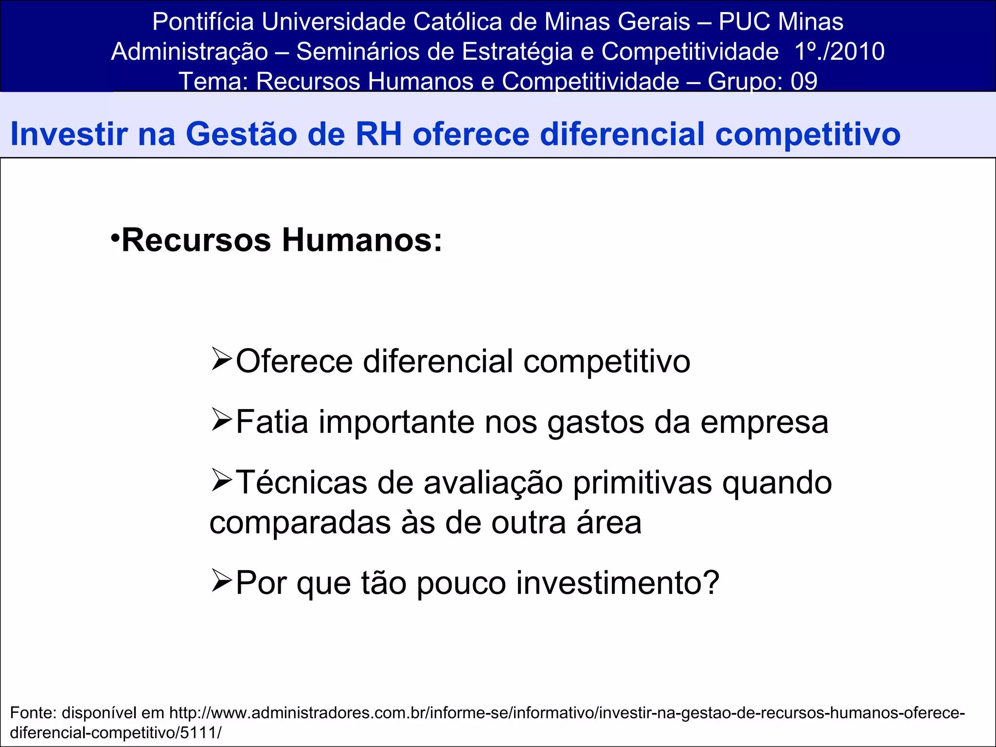 O documento discute como investir na gestão de recursos humanos pode oferecer uma vantagem competitiva para as empresas. Geralmente os recursos humanos são vistos apenas como uma despesa, mas eles podem agregar valor se gerenciados de forma estratégica e sistêmica, com foco nos fatos e no valor agregado. Técnicas primitivas de avaliação de desempenho são comuns, e há pouca ligação entre as decisões sobre recursos humanos e a estratégia geral da empresa.