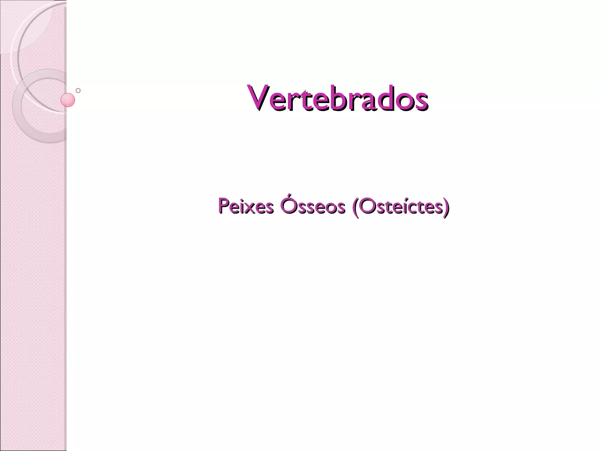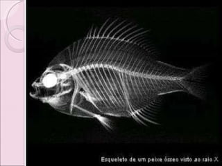 Os peixes ósseos são o grupo mais vasto de peixes atuais, habitando todos os tipos de água. São caracterizados por esqueleto ósseo, escamas, barbatanas sustentadas por raios e sistema respiratório com brânquias. Formam grandes cardumes para defesa e alimentação. São amplamente pescados para alimentação humana e animal, ameaçando muitas espécies.