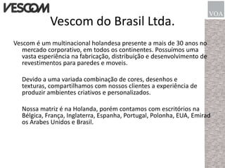 Vescom é uma empresa holandesa presente há mais de 30 anos no mercado corporativo em diversos continentes. Eles fabricam e distribuem revestimentos para paredes e móveis em uma variedade de cores, desenhos e texturas. A empresa possui escritórios em vários países incluindo o Brasil. Vescom fornece soluções para diferentes segmentos como hospitalar, hotelaria e corporativo.