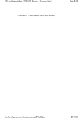 O documento descreve como o Ato Institucional no 5 (AI-5) em 1968 consolidou a ditadura militar no Brasil após o golpe de 1964, eliminando as liberdades públicas. Relata as formas de resistência política, sindical e cultural ao regime, incluindo greves operárias, deputados depostos e festivais musicais que criticavam abertamente o governo militar através de músicas como "Caminhando".