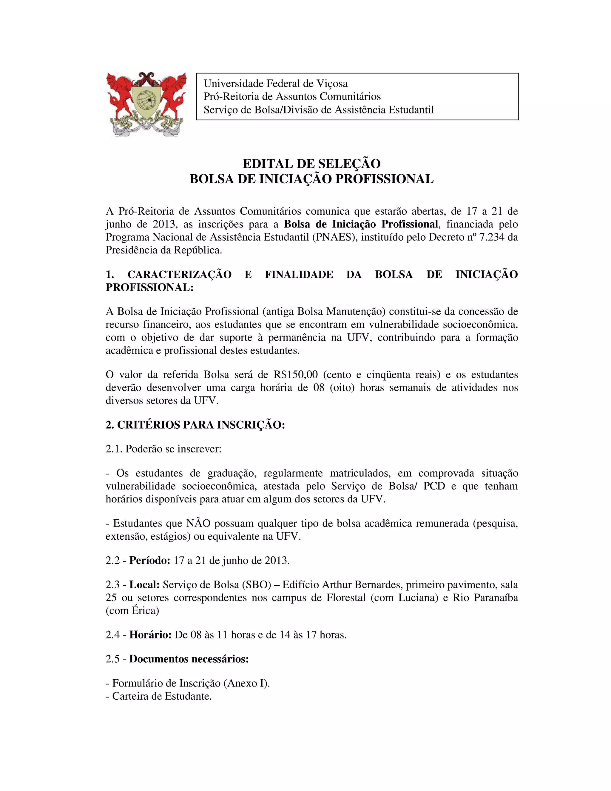 1) O documento anuncia a abertura das inscrições para a Bolsa de Iniciação Profissional da UFV entre os dias 17 a 21 de junho de 2013.