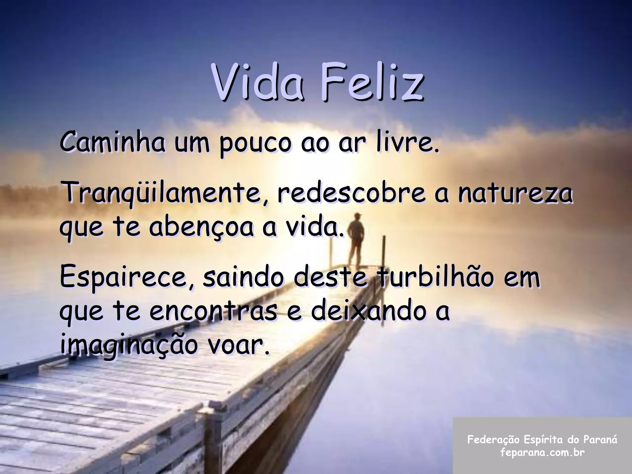 O documento recomenda caminhar na natureza para se acalmar e encontrar felicidade, longe dos lugares agitados, inspirando o ar puro e refazendo conceitos para abençoar a vida como ela é apresentada, pois a existência atual já oferece o necessário para ser feliz.