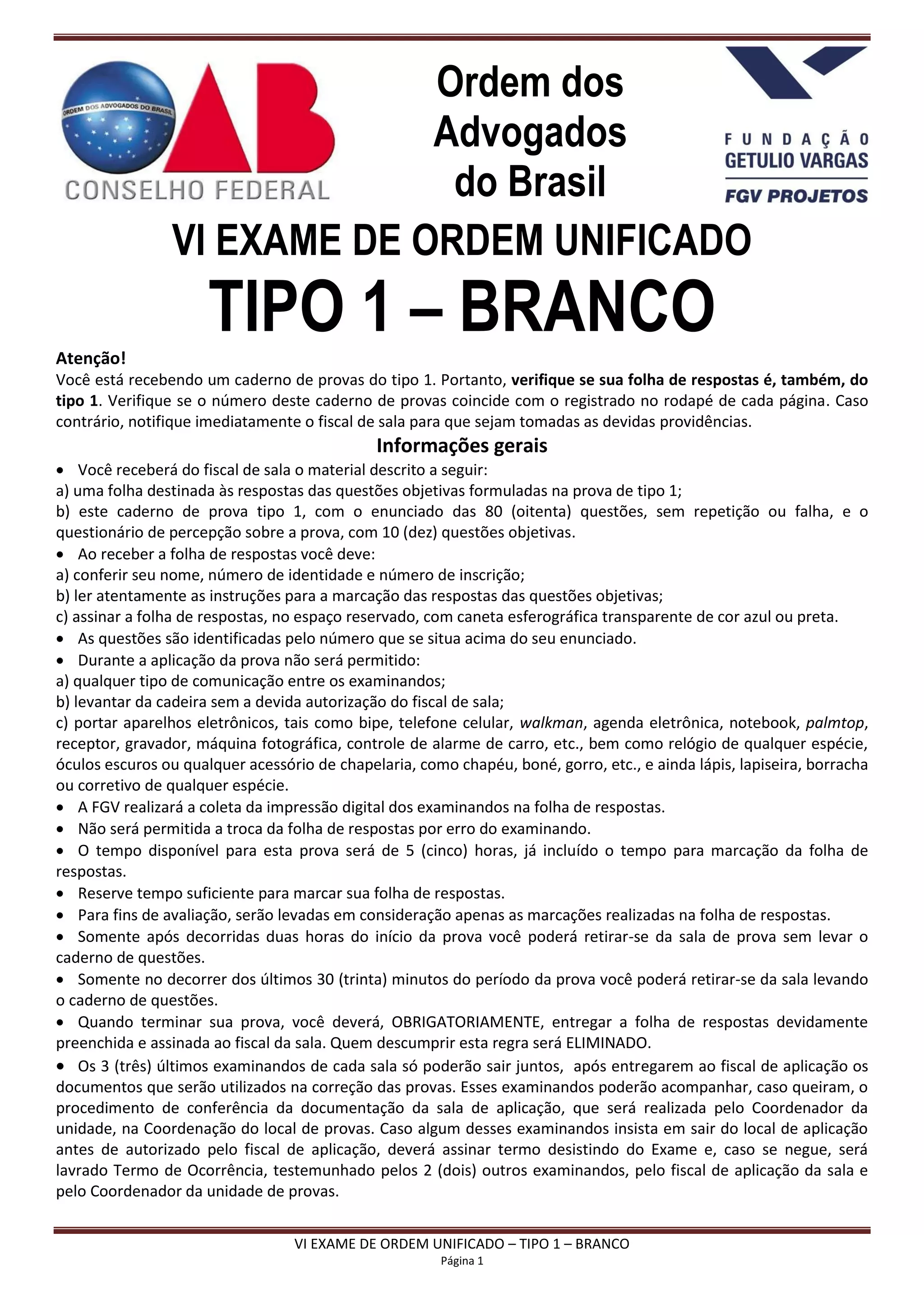 Este documento fornece instruções sobre a realização da prova do Exame de Ordem Unificado. Informa sobre o material que será fornecido, como conferir os dados na folha de respostas, assinar a folha, regras durante a prova, tempo de duração e procedimentos ao final.