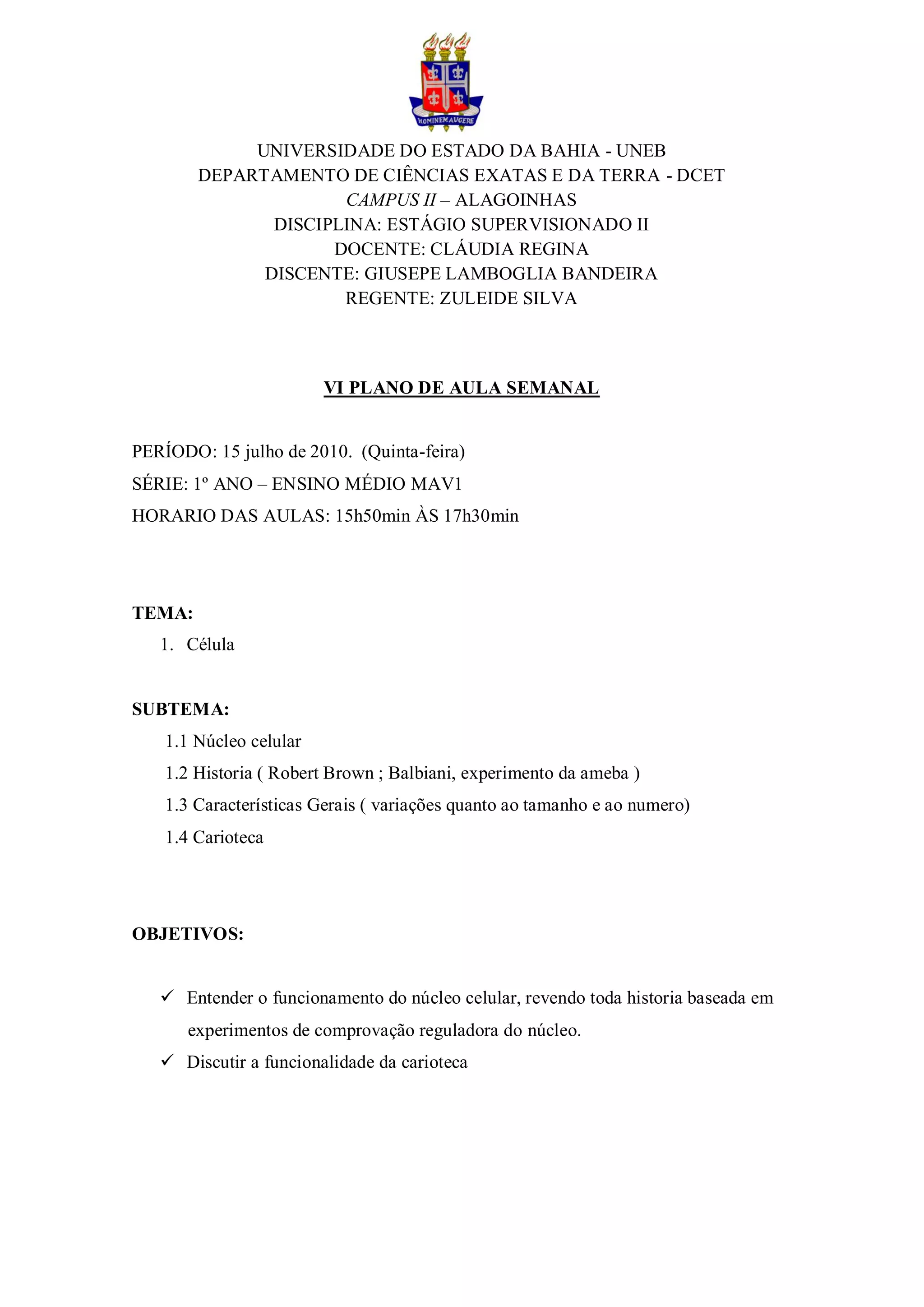 Este documento apresenta o plano de aula semanal para uma turma de 1o ano do ensino médio. A aula irá abordar o tema "Célula", com foco nos subtemas "Núcleo celular" e "Carioteca". O objetivo é entender o funcionamento do núcleo celular e discutir a funcionalidade da carioteca. A aula será expositiva e dialógica, com demonstrações de desenhos e vídeo para explicar as estruturas do núcleo celular.