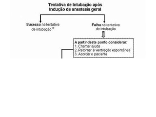 Comparação das viasde intubação Via Oral Rápida Visualização direta Respiração independente Tubo de maior calibre Acesso oral mínimo Laringoscopia Traumatismo laríngeo Via Nasal Técnica às cegas Acesso cirurgico oral Necessita de tempo Respiração dependente Traumatismo nasal Pequena sonda de intubação Falhas frequentes Vantagens Desvantagens