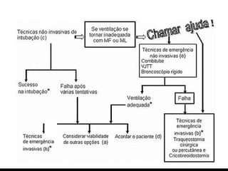 Passos para intubaçãooral Pré-oxigenação 100% FIO 2 3 a 5 min ou 4 inspirações profundas Sem ventilação com pressão positiva, exceto se Sat O 2 < 90% Se VPP, manobra de Sellick