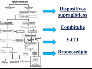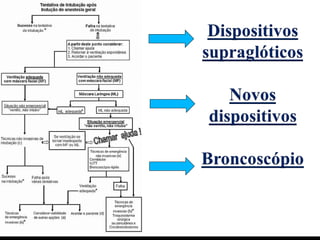 (Recommandé par laSoc Française Anésthésie Réanimation) Lista de equipamentos para intubação dificil Lista mínima Lista completa - Laringoscópio - Laringoscópio - Guias maleáveis - Guias maleáveis - Mascara laríngea - Guia luminoso (Trachlight) - Oxigenação transtraqueal - Mascara laríngea - Intubação retrograda - Fastrach - Oxigenação transtraqueal - IOT retrógrada - Fibroscopia bronquica