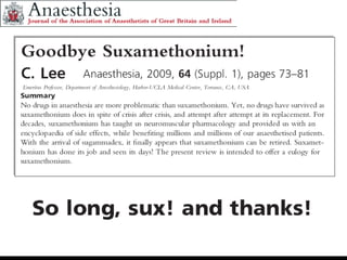 Can Succinylcholine BeAbandoned? Cook, D. Ryan MD Volume 90(5S) Supplement, May 2000, pp S24-S28 Nonneuromuscular Blocking Effects: Dysrhythmias Pulmonary Edema and Hemorrhage Intragastric Pressure Intraocular Pressure Hyperkalemia and Myoglobinemia Hyperkalemic Cardiac Arrest and Occult Myopathies Malignant Hyperthermia and Masseter Spasm