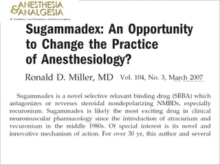 #58 Sugammadex is a novel selective relaxant binding drug (SRBA) which antagonizes or reverses steroidal nondepolarizing NMBDs, especially rocuronium. Sugammadex is likely the most exciting drug in clinical neuromuscular pharmacology since the introduction of atracurium and vecuronium in the middle 1980s. Of special interest is its novel and innovative mechanism of action. For over 30 yr, this author and several other investigators had many lengthy conversations and small meetings