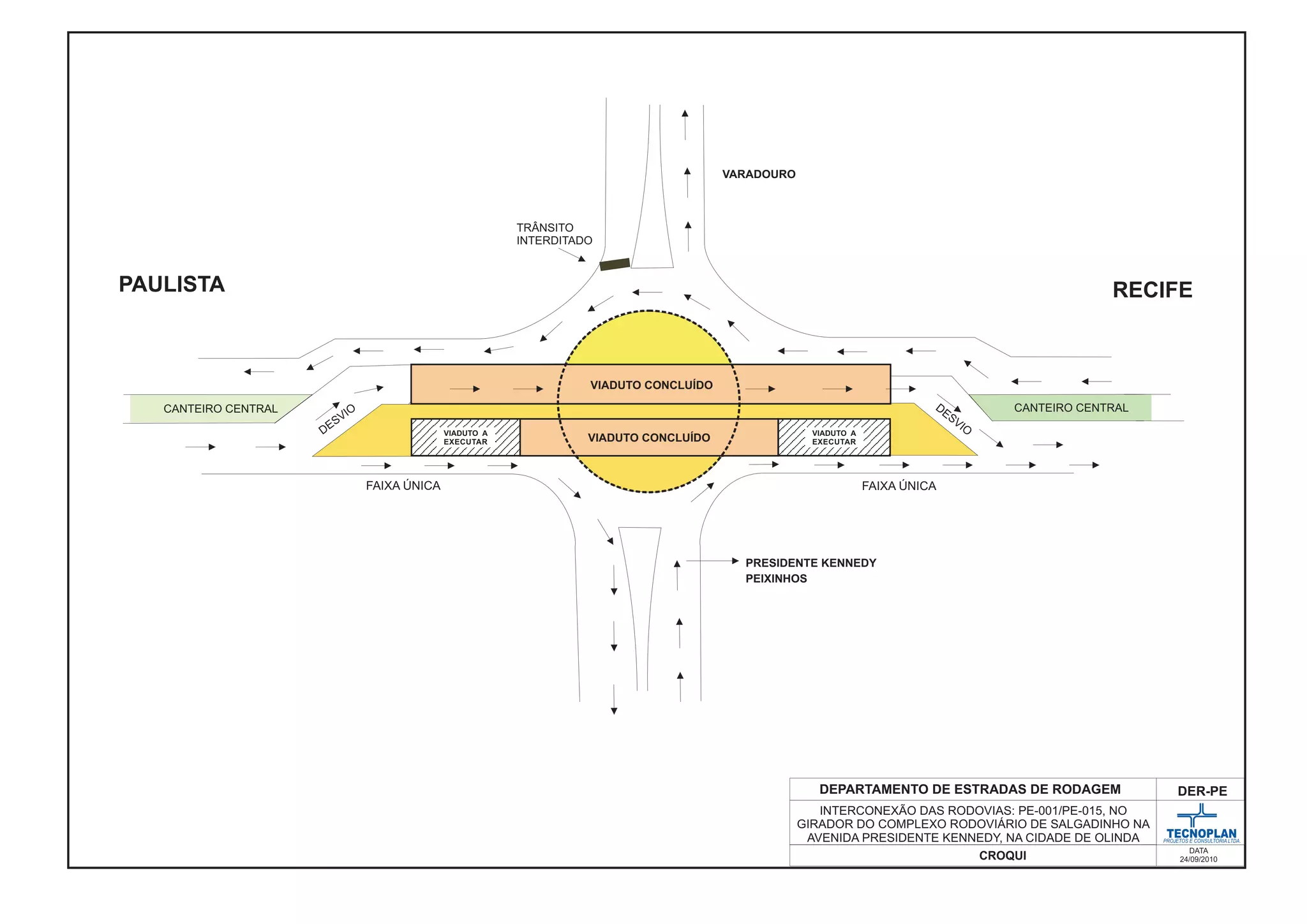 O documento apresenta um croqui de um complexo rodoviário em Olinda, Pernambuco. Ele mostra a interconexão entre as rodovias PE-001 e PE-015 no cruzamento da Avenida Presidente Kennedy, com a conclusão de um viaduto e outro em execução para melhorar o fluxo de trânsito.