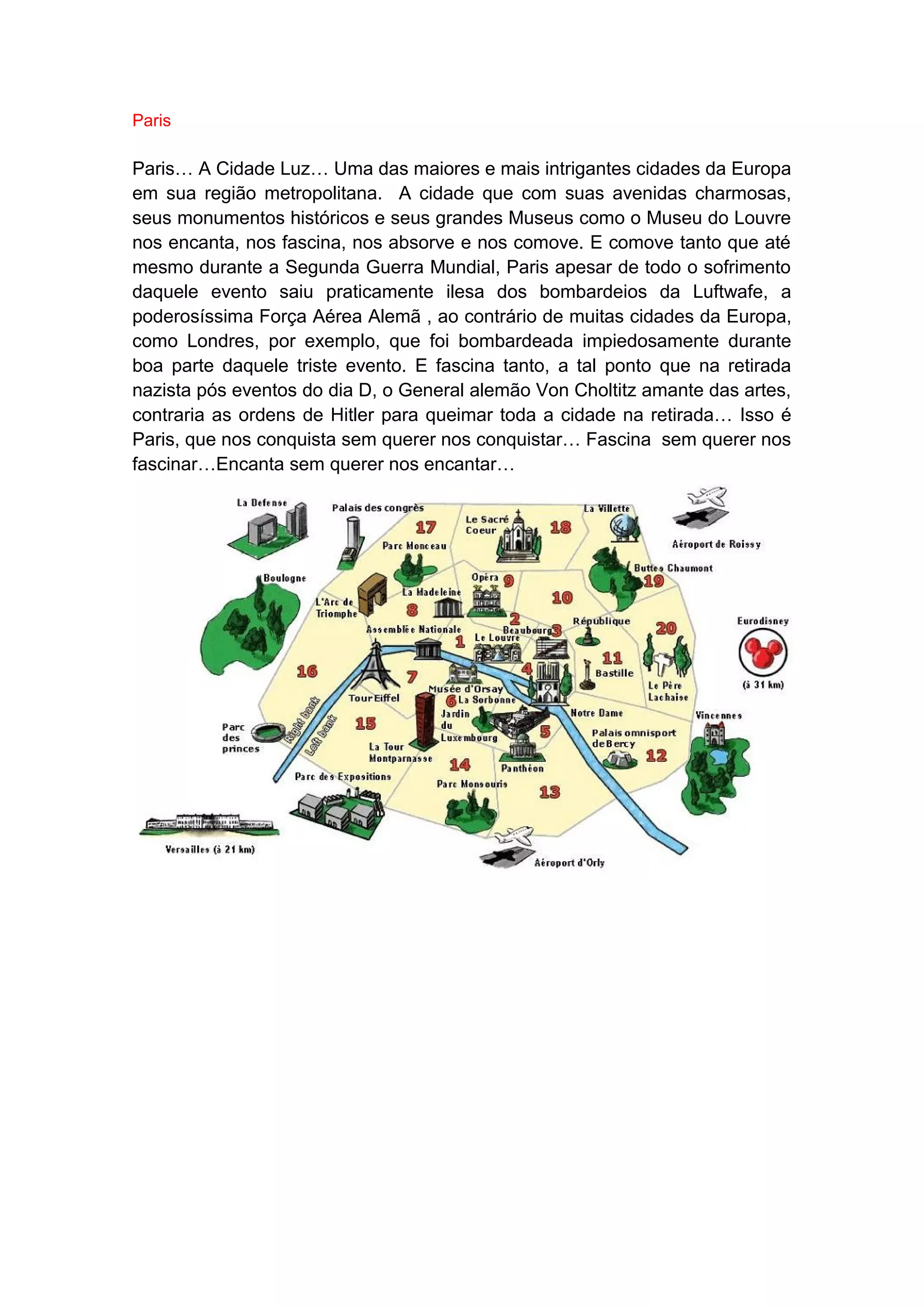 Paris é descrita como uma das maiores e mais intrigantes cidades da Europa, conhecida por suas avenidas, monumentos históricos e museus. Apesar dos bombardeios durante a Segunda Guerra Mundial, a cidade saiu praticamente ilesa graças à decisão de um general alemão de não destruí-la.