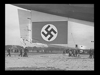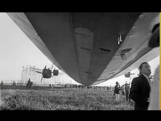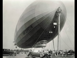 O documento descreve a história do Graf Zeppelin, o maior dirigível da época. Com 213m de comprimento, transportava passageiros em viagens transatlânticas entre 1928-1937. Realizou o primeiro voo ao redor do mundo em 1929. Sua era chegou ao fim com o acidente do Hindenburg em 1937, encerrando a era dos dirigíveis.