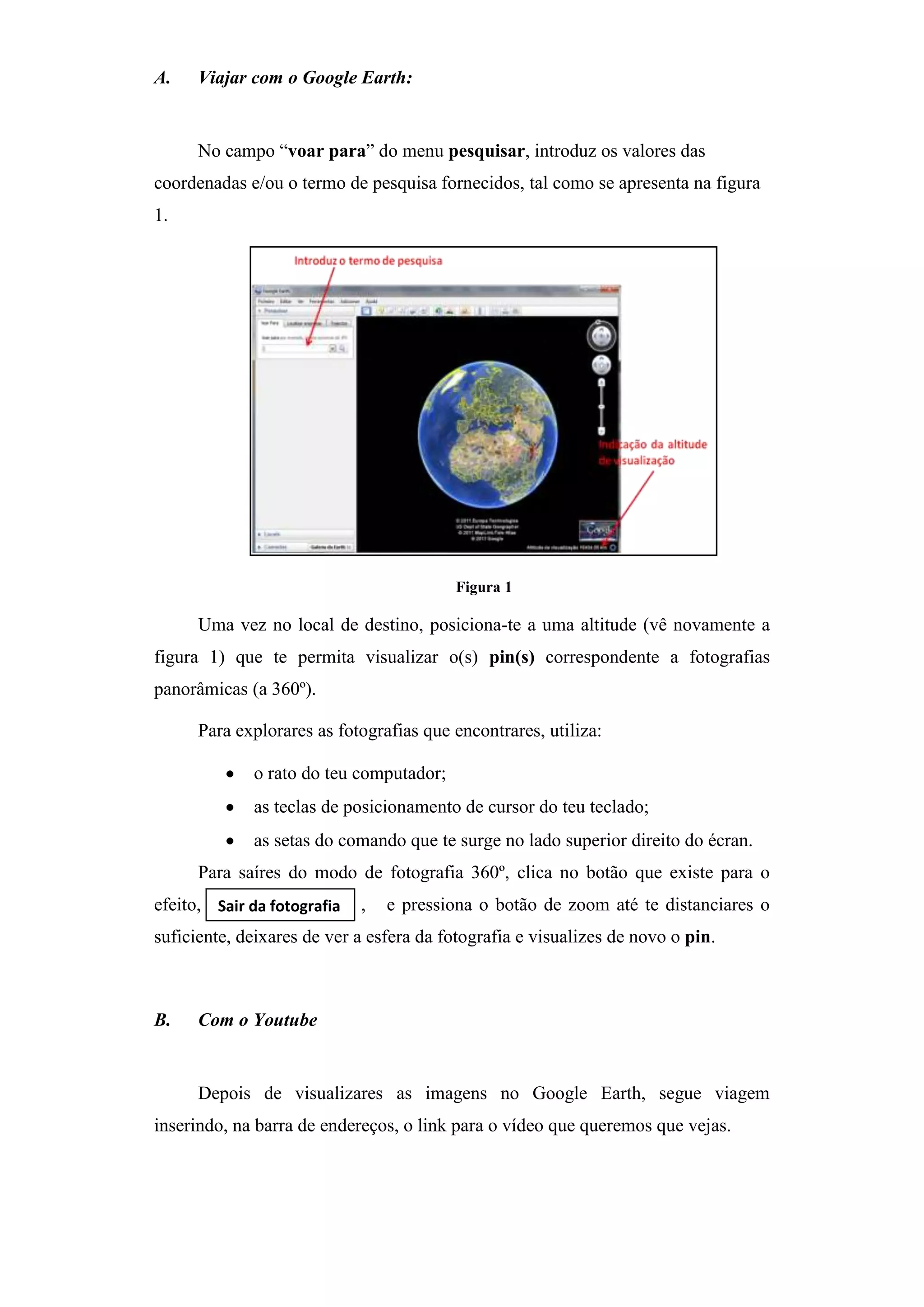 Este documento fornece instruções sobre como usar o Google Earth para explorar locais em todo o mundo. Ele explica como inserir coordenadas ou termos de pesquisa para voar para um local, como navegar em fotos panorâmicas 360° e vídeos no local, e como sair do modo de foto.