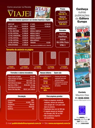 Este documento fornece informações sobre uma revista de viagens, incluindo detalhes sobre seu conteúdo, público-alvo, prazos de publicação e preços de anúncios. A revista oferece roteiros, dicas de viagem e experiências recomendadas por especialistas para ajudar leitores a planejarem suas férias. Ela também fornece contato com a editora e detalhes sobre formatos e preços de anúncios para empresas que desejam se promover na publicação.