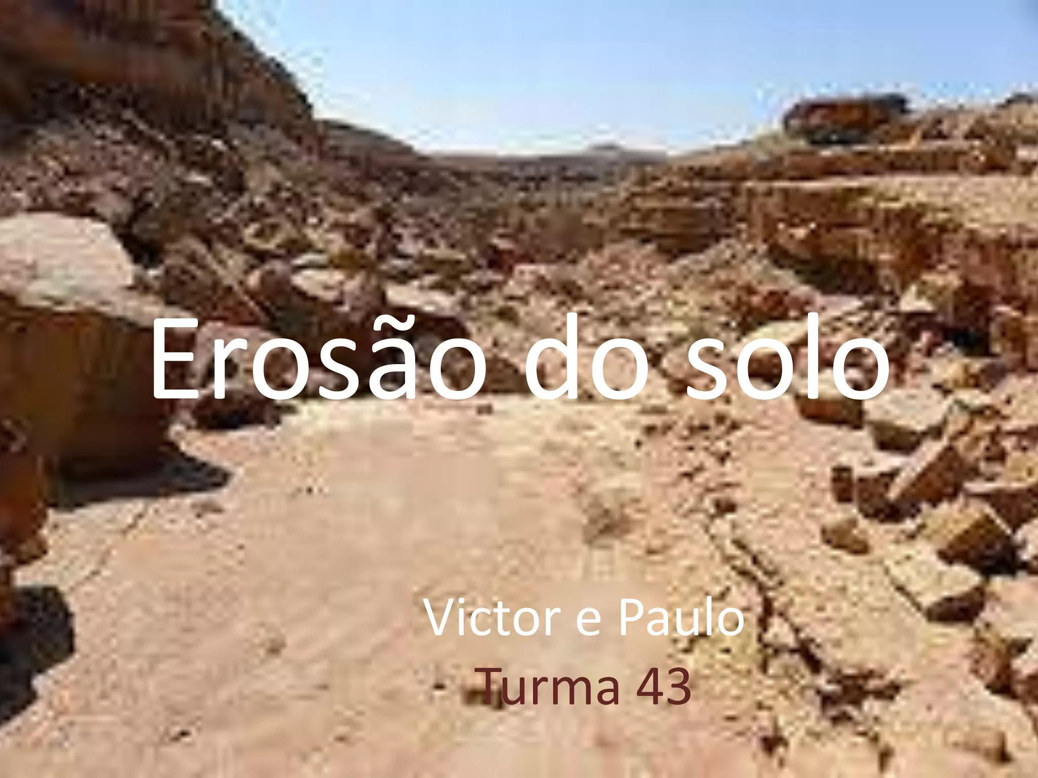 Erosão do solo é o desgaste e transporte do solo e rochas pela água, vento ou gelo. A erosão destrói as estruturas que compõem o solo como areia, argila e húmus. O documento fornece um link para um vídeo sobre erosão do solo.