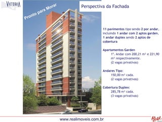 O documento descreve o empreendimento residencial Victória Residence em Santos, SP. O projeto conta com 24 unidades distribuídas em 11 andares com 2 apartamentos por andar, incluindo unidades garden no 1o andar e coberturas duplex. As unidades possuem de 150m2 a 285m2 com 2 ou 3 vagas de garagem. O condomínio oferece diversas áreas de lazer e conveniência.