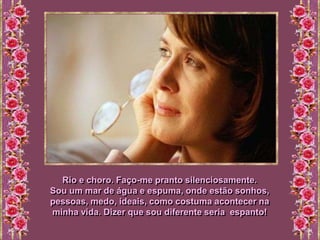 O documento é uma reflexão poética sobre a vida da autora como um "mar de água e espuma" cheio de sonhos, medo e ideais. A autora diz que não é paciente, mas sim calma, e acredita que terá tempo para consertar os erros do passado e subir levemente para o céu. Ela vive cumprindo seus deveres mas contente, gostando agora de seu mundo interior para enfrentar as dores da vida.