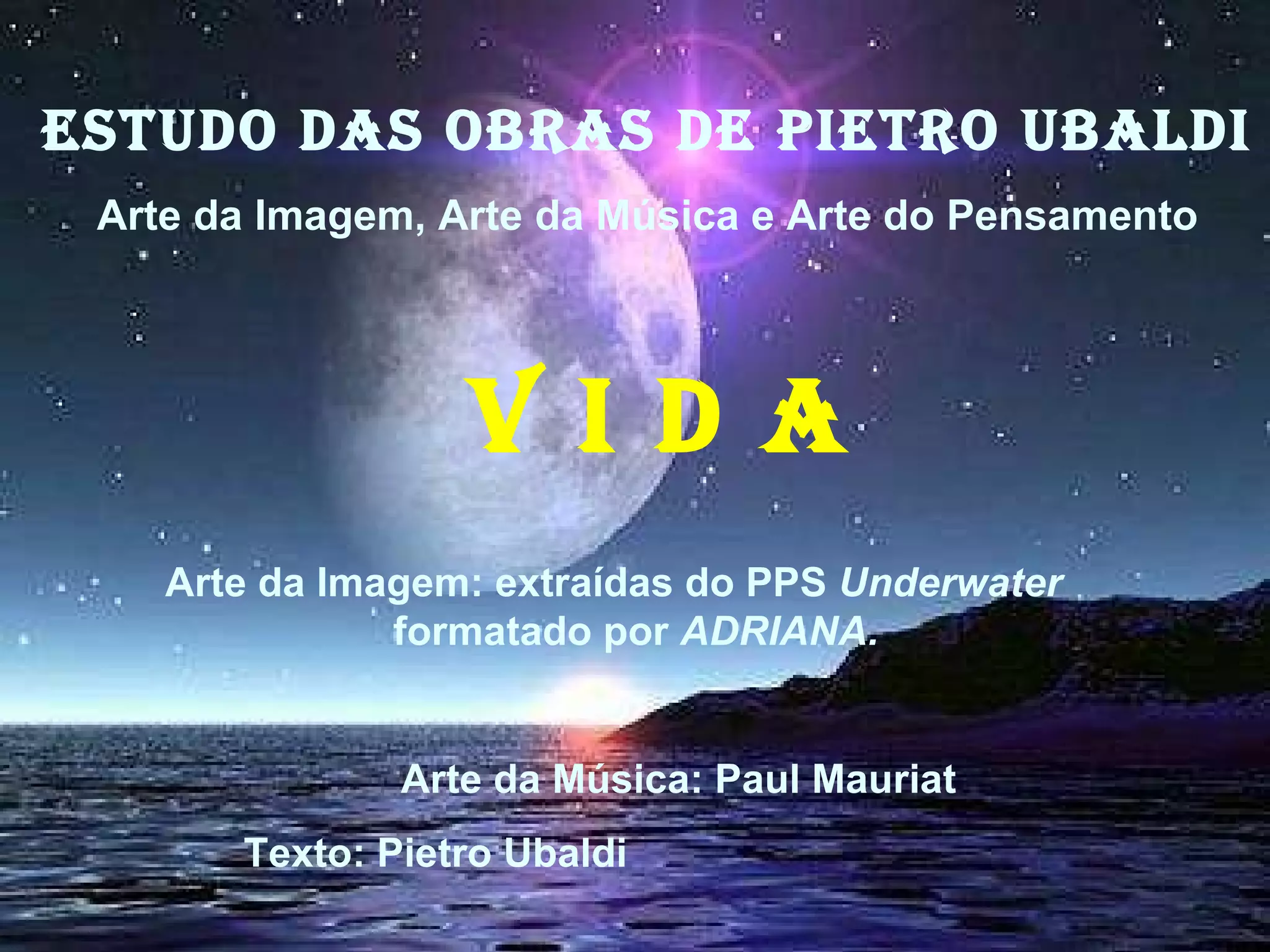 O documento discute a beleza e harmonia da vida submarina e como isso nos leva a refletir sobre as leis da natureza e a existência de um criador. Também convida a apreciar a arte da imagem, música e pensamento de Pietro Ubaldi para meditar sobre a vida.