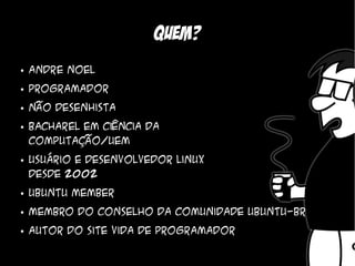 André Noel é um programador e membro da comunidade Ubuntu, destacando-se na era social onde a informação é rapidamente transmitida. O documento discute como publicar conteúdo eficazmente, enfatizando a importância de textos claros e imagens, além de como gerenciar e comunicar-se com o público. O público do site 'Vida de Programador' é composto por programadores, não-programadores e comentaristas diversos que apreciam o humor relacionado a situações da programação.