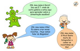 O documento apresenta uma aula sobre o magnésio minado por personagens fictícios, abordando as funções do magnésio no corpo, fontes alimentares e um cardápio do dia com opções ricas em magnésio. É fornecido um guia ilustrado da pirâmide alimentar e receitas para atividades práticas.