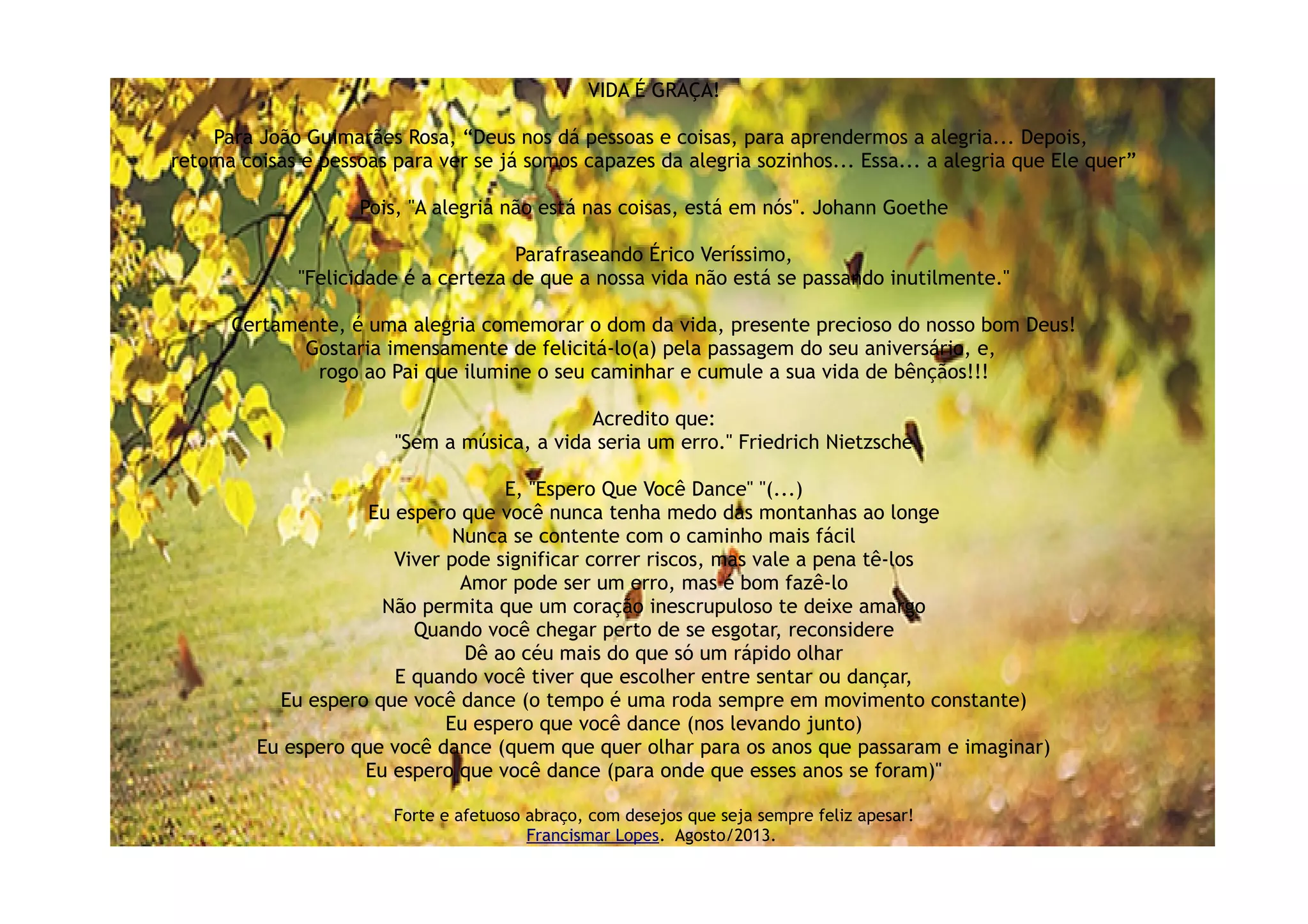 O documento expressa uma celebração da vida e da alegria, citando filósofos como Guimarães Rosa e Goethe para ressaltar a importância da felicidade interna. Uma mensagem de aniversário é enviada, desejando bênçãos e encorajando a viver plenamente, dançar e correr riscos. O autor, Francismar Lopes, finaliza com um forte abraço e votos de felicidade contínua.