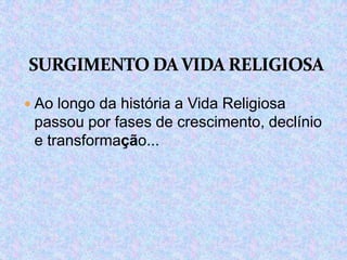 O documento descreve a história da vida religiosa ao longo dos séculos, dividida em diferentes períodos: do Deserto ao período das Congregações dedicadas ao ensino. Também aborda aspectos como a essência, os votos e a missão da vida consagrada na Igreja.